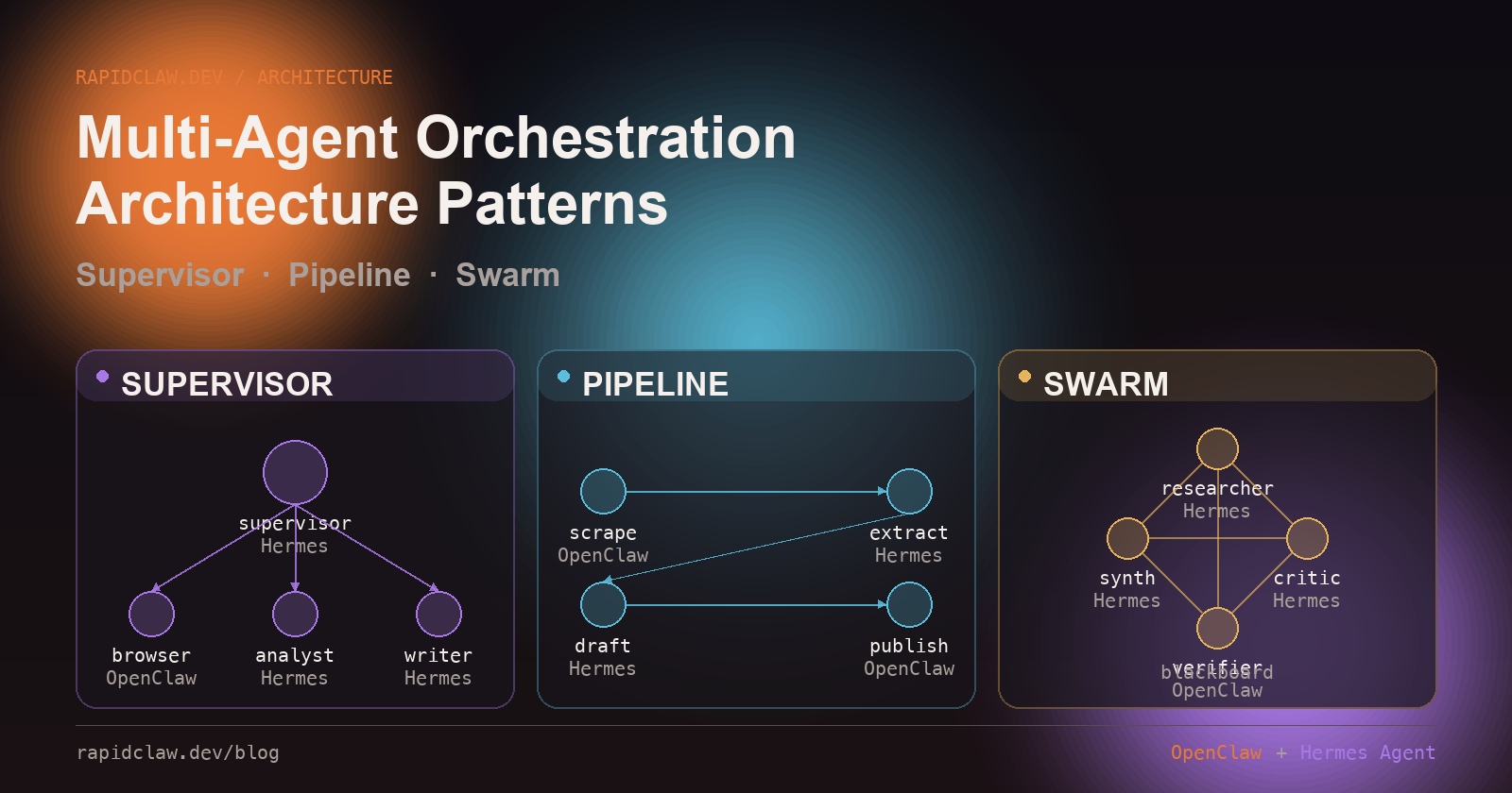 Three patterns cover ~90% of production multi-agent systems. Supervisor: one coordinator delegates to specialists — best for structured workflows with audit needs. Pipeline: sequential stages, each a specialist — best for predictable, staged work like content production or ETL. Swarm: peers collaborate, no central authority — best for exploration and parallelism. Mix OpenClaw (computer-use) and Hermes Agent (reasoning) inside any of them. Rapid Claw runs all three patterns out of the box.