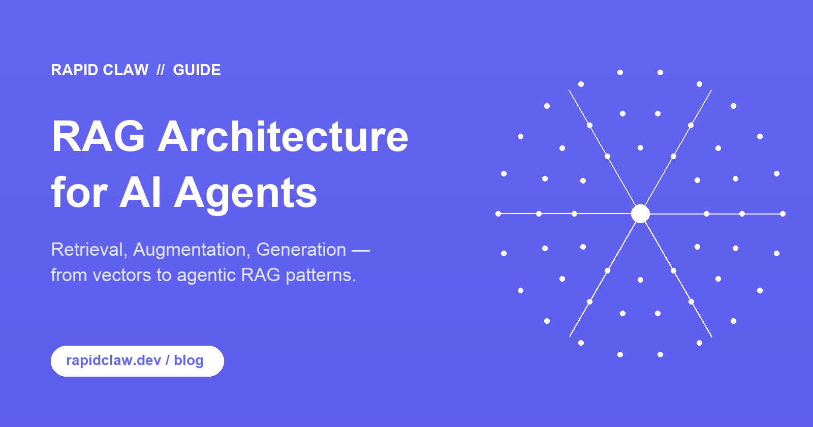 RAG architecture for AI agents is three stages: retrieval (find relevant context from a vector DB), augmentation (inject it into the prompt), generation (LLM produces a grounded answer). In 2026, the action has shifted to agentic RAG — where the agent itself decides when to retrieve, what to query, and whether to re-retrieve. Multi-hop RAG chains queries; self-reflective RAG critiques its own retrieval. This guide covers the components, the chunking and embedding tradeoffs, the agentic patterns, and how to deploy RAG-powered agents on Rapid Claw.