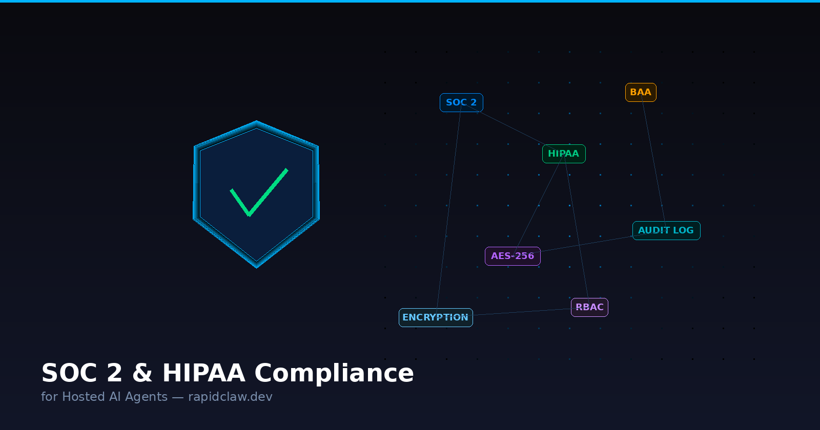 SOC 2 HIPAA AI agents compliance requires five pillars: encryption (AES-256 at rest, TLS 1.3 in transit), access control (RBAC + least-privilege), audit logging (immutable, 6-year retention for HIPAA), data residency (region-locked storage and inference), and a signed BAA for any PHI workload. This post includes implementation code for OpenClaw and Hermes, compliance checklists, and architecture patterns. Rapid Claw handles infrastructure-level controls out of the box — Enterprise plans include a BAA.